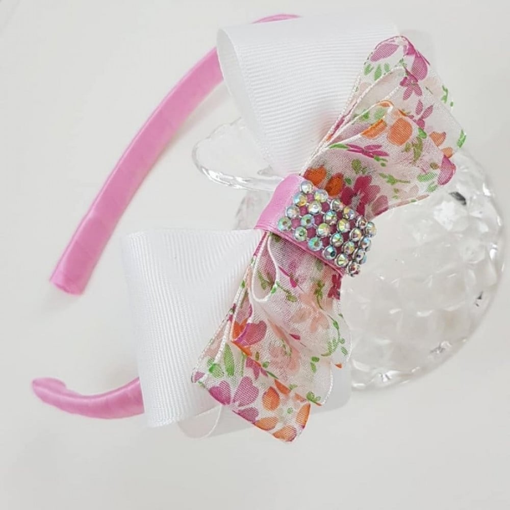 طوق فيونكة صغيرة باللون الأبيض مع شريط شيفون وردي مشجر hfr045 متجر طوق ديما